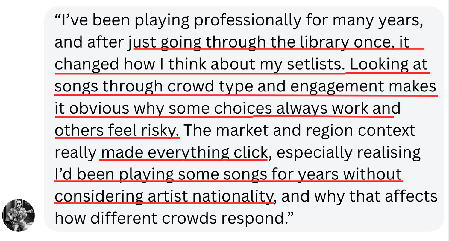 Most of the songs in this library come from real working setlists I was given to learn for gigs. Material refined and repeated night after night. Playing those sets across different rooms made it clear which songs hold energy and which quietly kill it.
