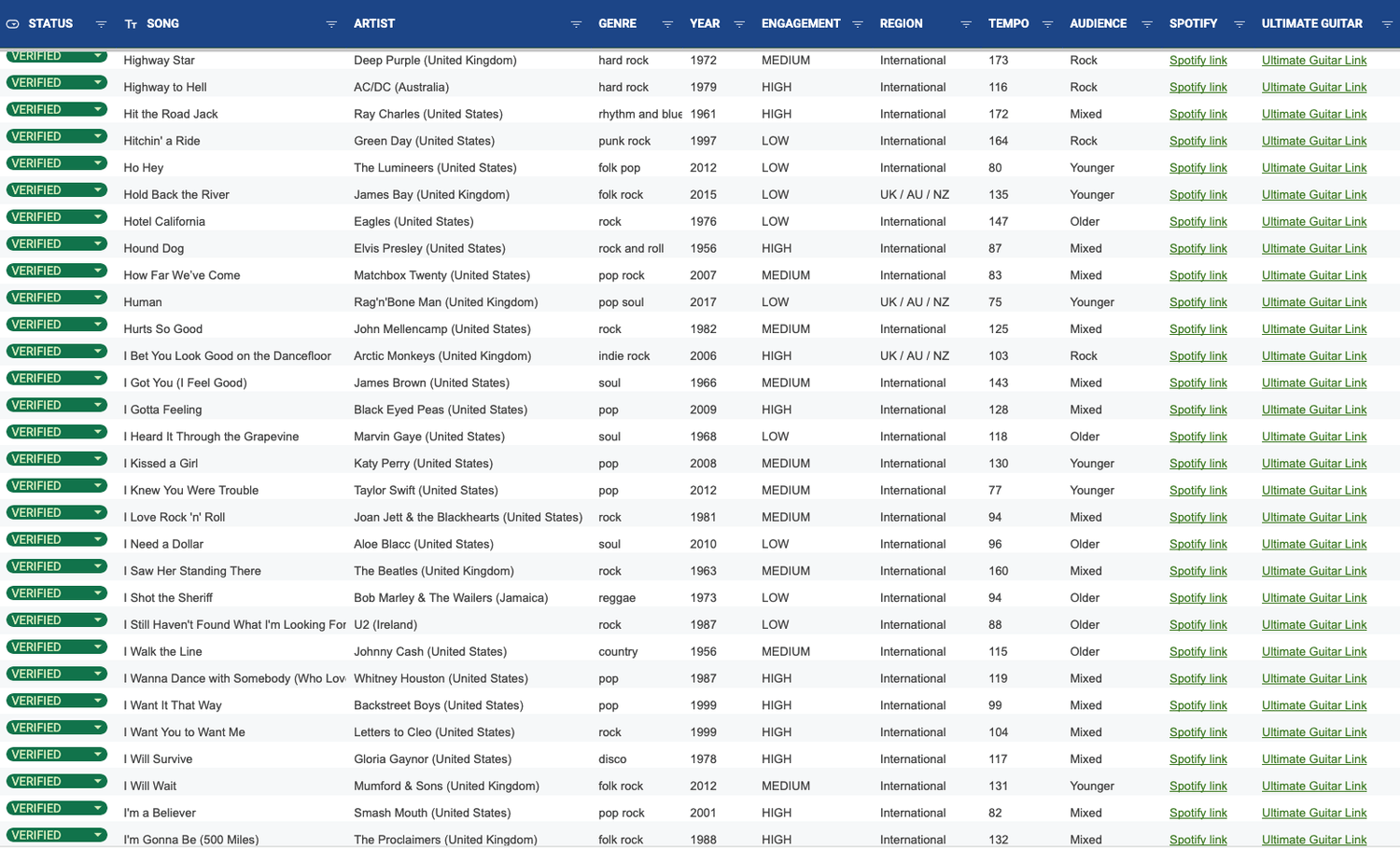 A curated, crowd-tested database of 400+ songs for cover artists.